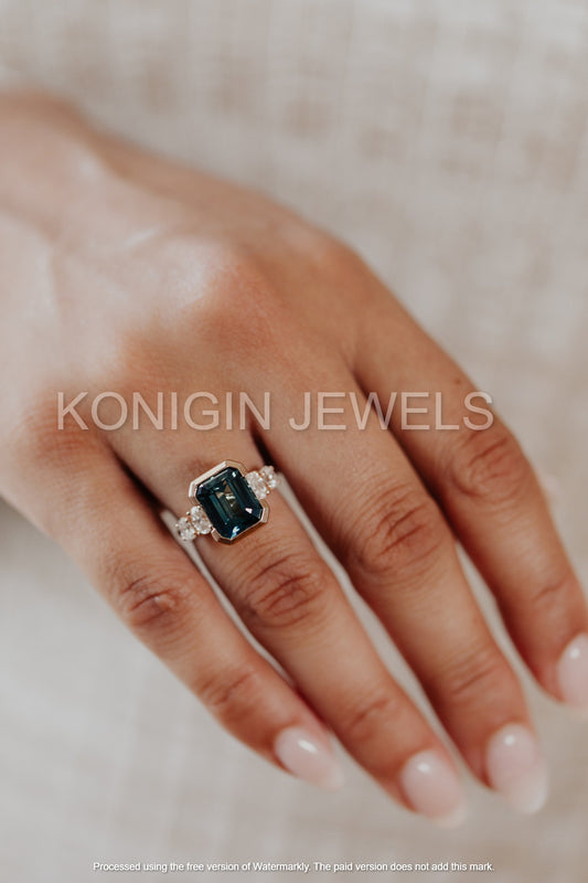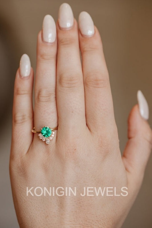 1CT Green Color Emerald With Colorless Oval Shape Moissanite Diamond Gold Designer Ring For Her